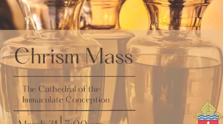 All are invited with family, friends, and many more faithful! The Annual Chrism Mass takes place once every year during Holy Week. In our Diocese, it will be on Tuesday evening of Holy Week, March 31, 7:00pm, at our magnificent and historic Mother Church, The Cathedral of the Immaculate Conception, 1695 Central Ave., Memphis.