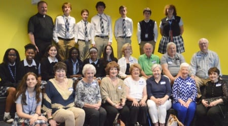 Kicking off their 65th reunion weekend, a dozen members of the 8th-grade Class of 1954 visited Immaculate Conception Cathedral School on Friday, May 3. Walking the halls and visiting classrooms in the original school building, the alumni reminisced about attending daily Mass, the nuns who taught them, and lifelong friendships formed. Their tour concluded in the library/media center, where the 8th-grade Class of 2019 joined them for a photo.