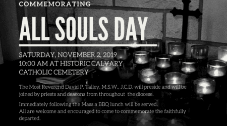 On Saturday, November 2, 2019, 10:00 am @ Calvary Catholic Cemetery, Bishop David will preside over the traditional All Souls Day Mass held at the historical cemetery. He will be joined by priests and deacons from throughout the diocese. Following the Mass a BBQ lunch will be served. All are welcome and encouraged to come.
