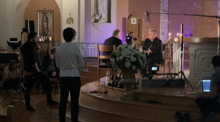 As soon as cameras and gear were unpacked, the film crew from DeSales Media Group flew drones around the exterior of the cathedral capturing the architecture and grounds , while videographers filmed the interior highlighting its beauty and history.