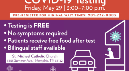 Memphis, Tenn. – On Friday, May 29, from 3-7pm, St. Michael’s Catholic Church is partnering with Church Health to offer free drive-thru COVID-19 testing. The event is open to everyone, whether or not a person has symptoms. There is no appointment needed, but it’s highly encouraged to pre-register to reduce wait times by calling: (901) 272-0003. Please bring an ID and contact information to check-in and receive follow-up instructions. All individuals tested will receive food from Mid-South Food Bank. The testing will have bilingual staff to make sure language is not a barrier to testing and health care. Also, please see the attached posters in English and Spanish on the testing.