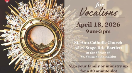 This Diocesan Day of Prayer will take place this Saturday, April 18, 9:00am-3:00pm, at our beautiful St. Ann Catholic Church, 6529 Stage Road, Bartlett, at the Shrine of Saint Faustina Kowalska.