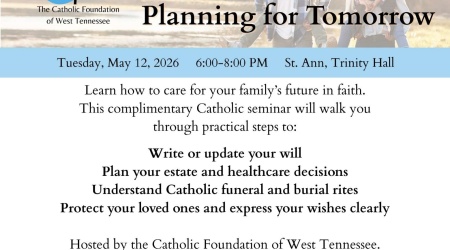 Planning for tomorrow is important. Please join our free Estate and End of Life Planning Seminar designed to help all of us plan wisely and faithfully on Tuesday evening, May 12, 6:00pm-8:00pm, at our beautiful St. Ann Catholic Church in Trinity Hall, Bartlett, Tenn. The seminar is being hosted and presented by the Catholic Foundation of West Tennessee.