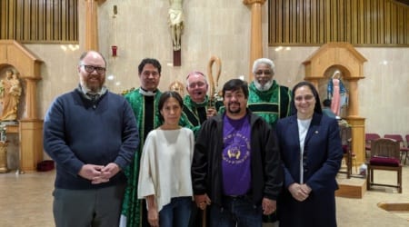 L to R: Sam Mauck, Director for Youth, Campus, and Young Adult Ministry; Fr. Tony Romo, SVD, Pastor; Gina Gomez, wife; Bishop David Talley; Jose Gomez; Deacon James Calicott; Sister Monica Darrichon, SSpS.