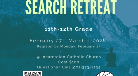 Sign up today! All Juniors and Seniors in High School are invited to attend our next Catholic Youth Ministry’s SEARCH Retreat, February 27-March 1, at our beautiful Catholic Church of the Incarnation, 360 Bray Station Rd., Collierville.