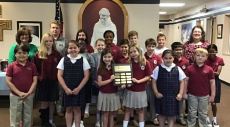 May 17, 2019 – For the first time this year, Catholic Charities of West Tennessee invited Catholic schools in our area to engage in a little friendly fundraising competition by hosting a Jeans Day benefitting Catholic Charities and the work they do to help the needy members in our community. The school that raised the most money per student would have the honor of displaying the traveling Jeans Day plaque at their school for the year. The six schools that participated raised over $3,800 for Catholic Charities where they serve those in need through the Housing Ministery, Food Pantry, mobile food distribution, Clothing Closet, Reading Room, and the Immigration program. Of the six participating schools, SFA raised the most per student and was awarded the Jeans Day plaque by Mrs. Brenda O’Looney from Catholic Charities of West TN.